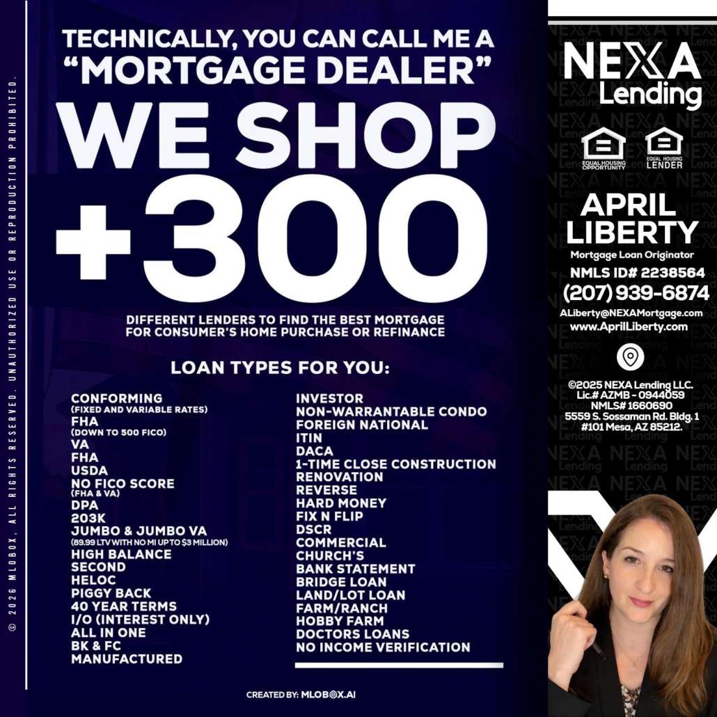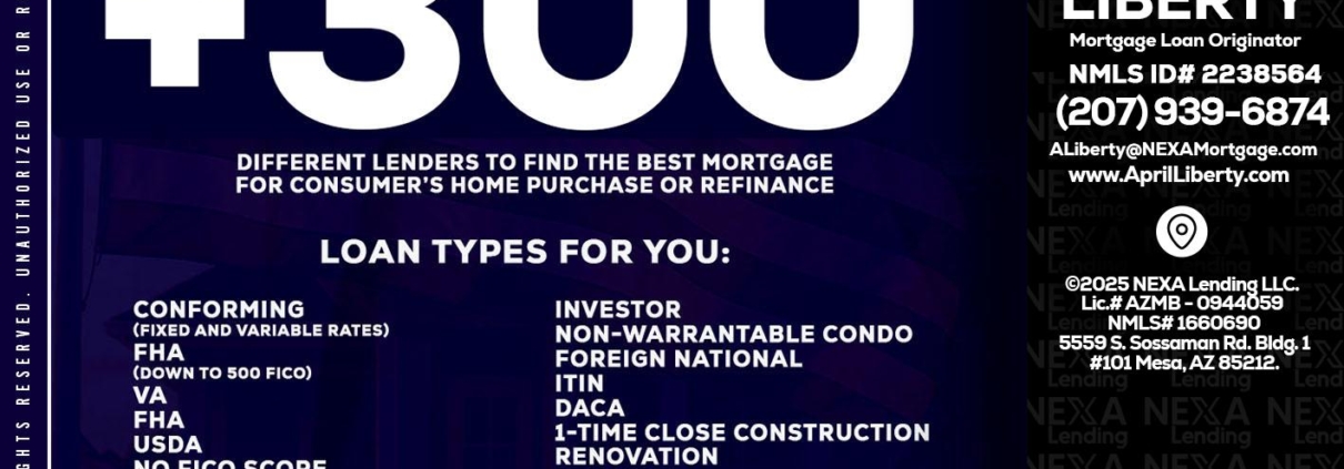 300+ LENDERS - April Liberty -Mortgage Loan OriginatorHi, my name is April Liberty. I’m a Loan Officer with NEXA Lending LLC., offering personalized mortgage solutions, fast customized quotes, great rates and service with integrity.